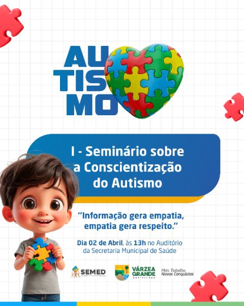 A Prefeitura de Várzea Grande através da Secretaria Municipal de Educação realizará no dia mundial de conscientização do autismo, dia 02 de abril, o 1º Seminário Sobre a Conscientização do Autismo, a partir das 13h no auditório da Secretaria de Saúde, todos os educadores, gestores escolares, pais, mães e reponsávies pelos alunos da rede municipal de ensino são convidados para esse momento de conhecimento, aprendizagem e troca de experências sobre o autismo.
