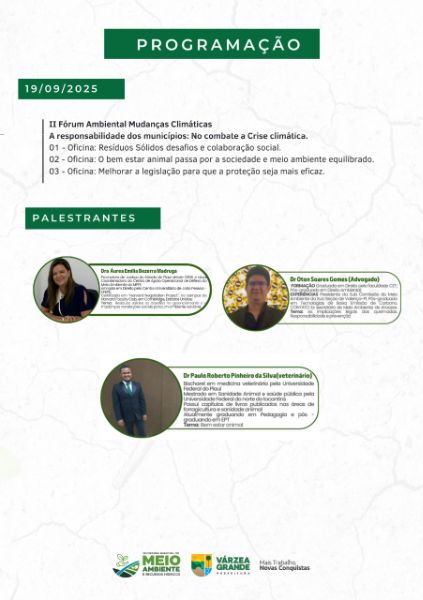 No último dia 19 de setembro, a Prefeitura de Várzea Grande, através da Secretaria Municipal de Meio Ambiente e Recursos Hídricos realizou o segundo Fórum Ambiental de Várzea Grande com o tema "Mudanças climáticas e a responsabilidade dos municípios", com isso com o município abriu um canal de diálogo com a sociedade buscando respostas para os mais diversos problemas na área ambiental, que mostra segundo o Secretário Mundico "que estamos construindo política pública ambiental baseada no diálogo e na realidade do nosso município, pois um fórum desta natureza é para que cada cidadão tenha a oportunidade que dizer quais suas preocupações".